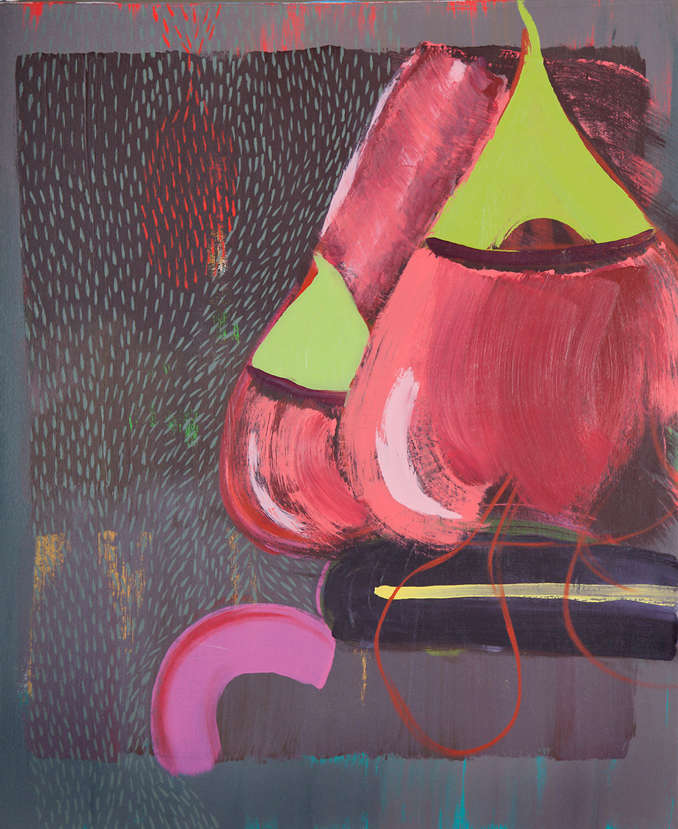 The domestic narrative paintings are drawn from specific scenes I’ve witnessed in both my own and friend’s families. The horror and humor of domestic life is revealed as abstracted organic shapes, meant to represent specific characters engaged in a larger narrative. The title hints at a possible story for the viewer to imagine.