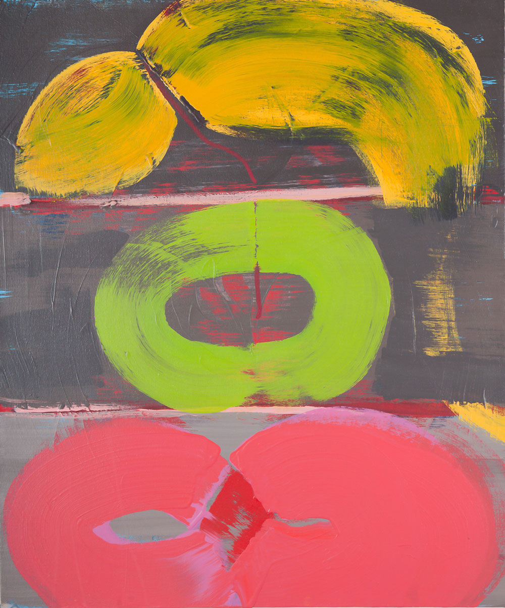 The domestic narrative paintings are drawn from specific scenes I’ve witnessed in both my own and friend’s families. The horror and humor of domestic life is revealed as abstracted organic shapes, meant to represent specific characters engaged in a larger narrative. The title hints at a possible story for the viewer to imagine.